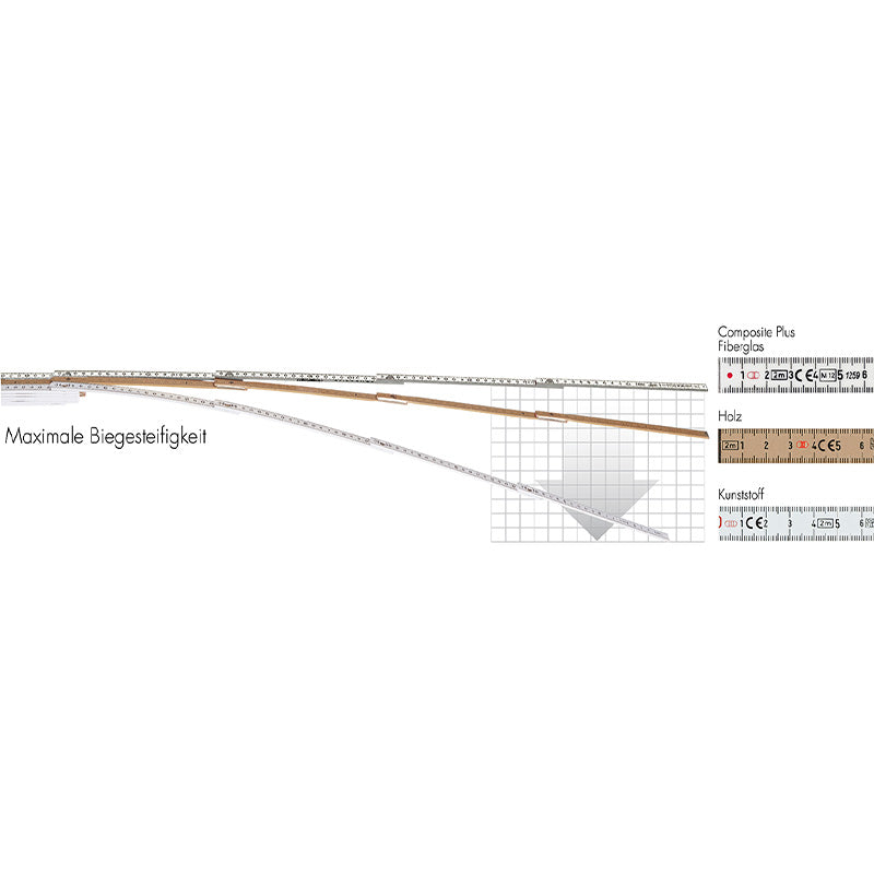 Unser Gliedermeter aus Composite-Material verbindet glasfaserverstärkten Kunststoff mit Glasfaser-Tapes und garantiert damit eine aussergewöhnliche Stabilität und Langlebigkeit. Egal ob auf der Baustelle oder im Handwerk – dieser Gliedermeter hält auch den härtesten Bedingungen stand.